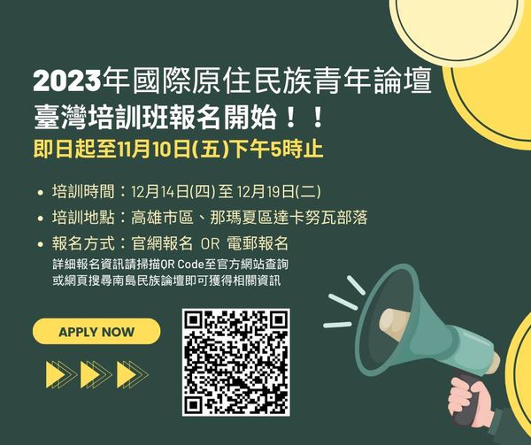 (三)報名時間:自即日起至112年11月10日(星期五)下午5時止,相關報名方式及課程資訊詳見「南島民族論壇」官方網站,網址:https://austronesianforum.org/taiwantrainingprogram