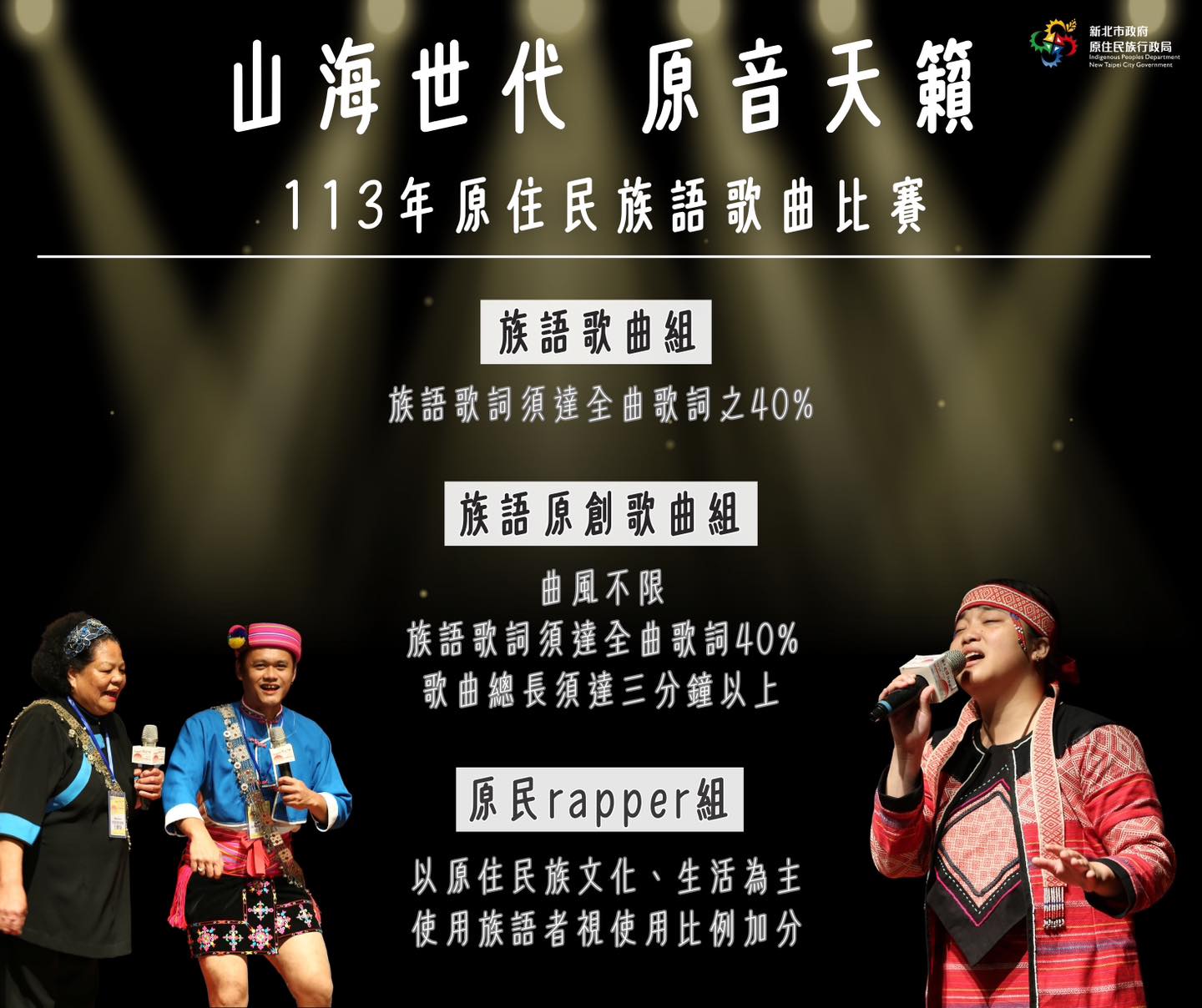 新北市政府原住民族行政局舉辦113年度原住民族語歌曲比賽,詳細內容請詳閱報名簡章,歡迎有興趣的同學踴躍報名。